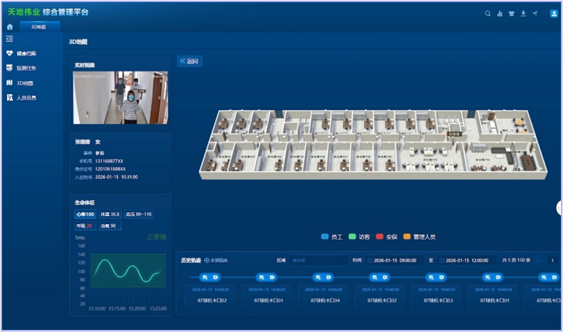 实时轨迹:数字地图上动态呈现人员精准位置,不同角色颜色区分,一眼掌握全域分布;历史回溯:一键调取任意时间段完整轨迹+关联视频,时间轴联动回放。